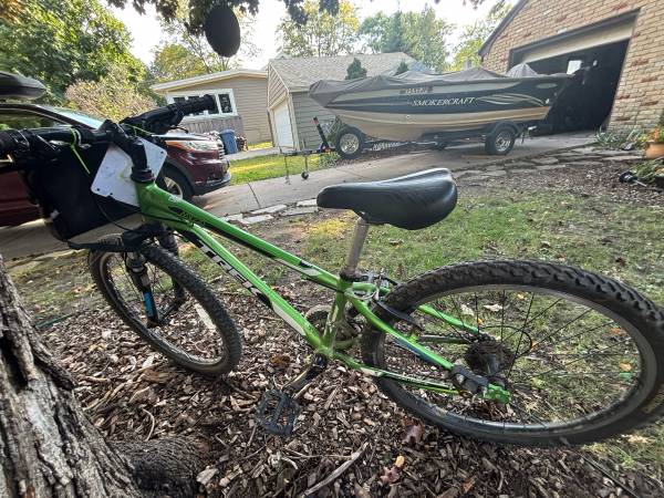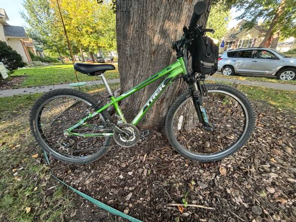 Green Trek mountain bike - 24 inch tires. MT 220 series. Light and solid. This was an excellent learning bike for my 7-10 year olds. Somehow they had great speed on this bike compared to then newer models we have gotten. A lot of new parts in recent time ups. A great bike if you are starting out in mountain bike club.