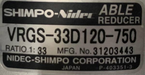 YASKAWA ELECTRIC AC SERVO MOTOR SGMAV-08ADA21 WITH NIDEC-SHIMPO REDUCER VRGS-33D120-750,SEE PICTURES OF LABELS FOR MORE INFO FOR THIS ITEM,ITEM IS USED,PULLED FROM WORKING ENVIRONMENT,YOU ARE PURCHASING ONLY WHAT IS PICTURED,PLEASE REVIEW PICTURES