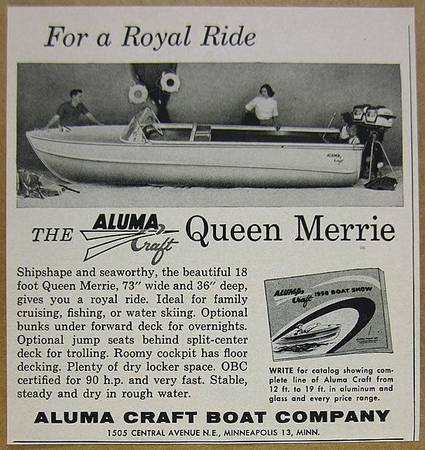 1958 Alumacraft 18’ Queen Merrie from the Yacht Club Fleet collection. A great boat for family cruising, a day on the water and fishing. Have had many years of fun! Specifications (see picture 16)...