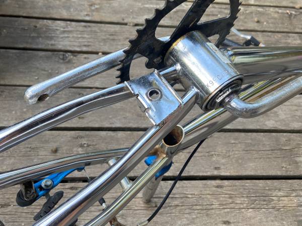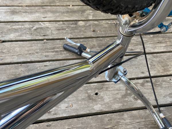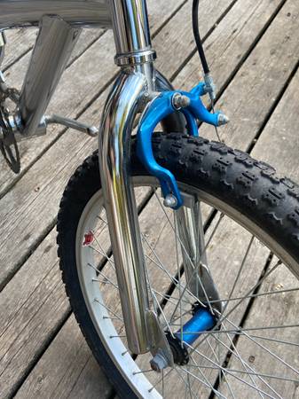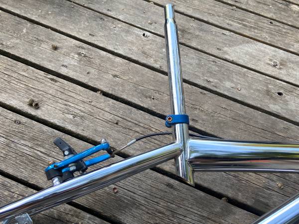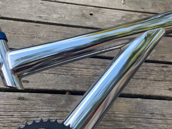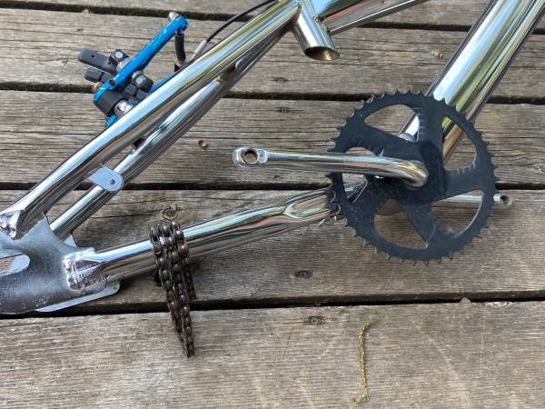 Chrome BMX Frame with chrome fork, chrome and blue anodized stem, chrome handlebars, chrome seatpost, blue anodized front and rear brake calipers, blue anodized seatpost clamp, alloy front 20 inch wheel with tire and tube, brake levers, chain, one piece crank with chainring