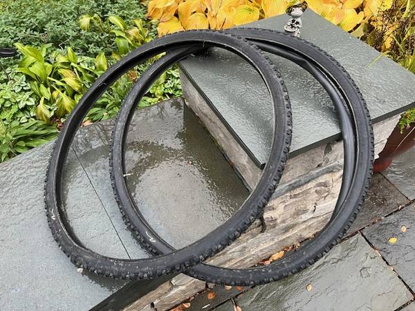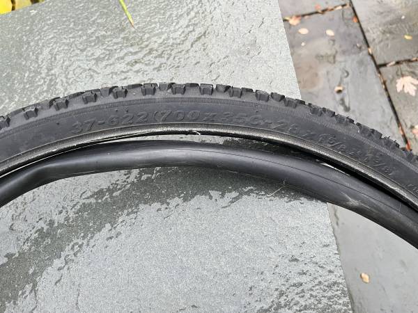 Kenda Studded tires. Skinny for a road bike or hybrid.