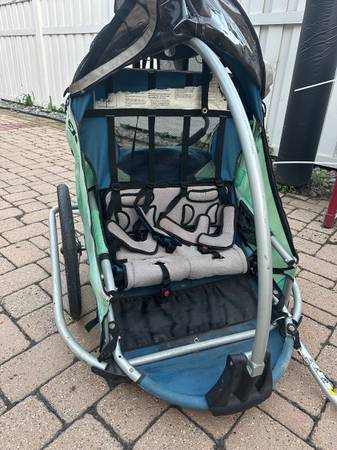 Kids doodlebug bike trailer for two kids. Includes separate rain cover.