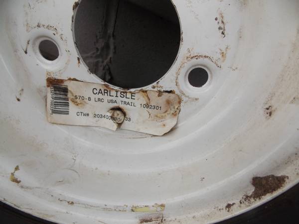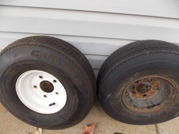 For this deal you get both of these. The Brand NEW Carlisle Tire and 8" 5 lug rim and the Spare one. That one is kind of old and should just be used as a spare. The wheels are the standard 5 lug and 4.5" center, or what they call 5x4.5 bolt pattern. The New Carlisle tire is a 4 nylon ply Highway service Load Range C tire Max. load 910 Lbs. most people accidently get the Load B tires, they are Max Load 715Lbs. . Cash and carry, no tax .If your Boat Snowmobile or utility Trailer needs some extra rubber, here you go. Call(952)854-5 seven eight six