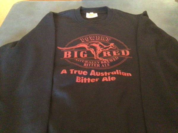 Here is a sweatshirt from Australia. It has the logo for Powers Big Red Bitter Ale. The shirt is in excellent condition. The label says XXL, but it might be more of an XL.