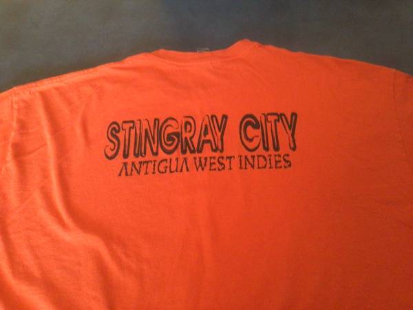 Here is a cool souvenir t-shirt from the Caribbean island of Antigua. The shirt has a large stingray image on the front, name of Stingray City on the back. This shirt is in excellent condition. Size 2XL.