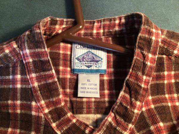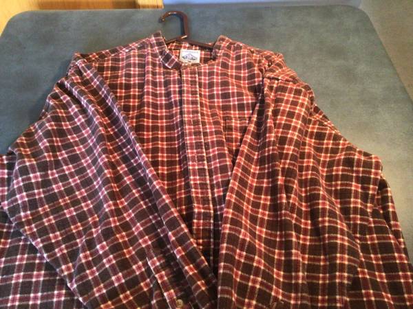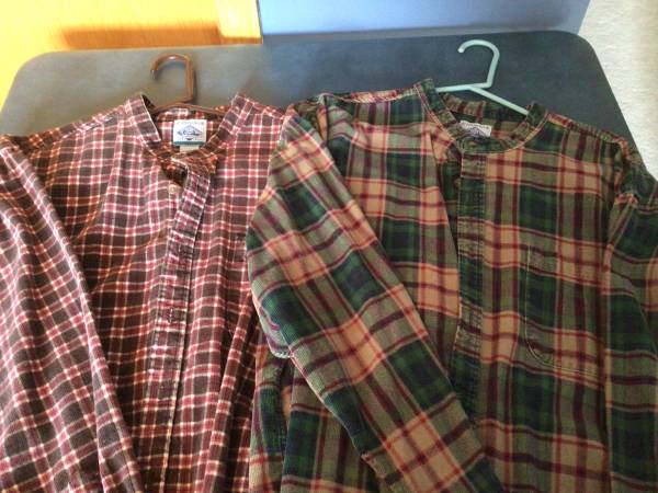 Here are two unique collarless shirts for men. These vintage shirts are very hard to find. These shirts are buttoned down the front. They are 100% cotton and appear to be a soft corduroy. Shirts are $8 EACH. Size extra large. These vintage shirts have been worn but are still in excellent condition. Machine washable.