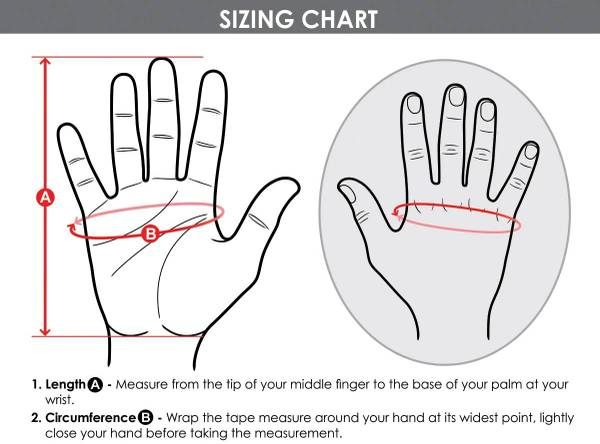 fits hand approximately 7 inches in length (measurement A in pictured sizing chart)