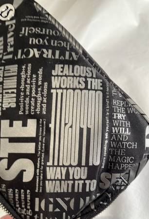 Words printed on bag in silver: "Dance Sing Floss and Travel." "Jealousy works the opposite way you want it to." "Positive thoughts words and action create positive thoughts words and actions."
