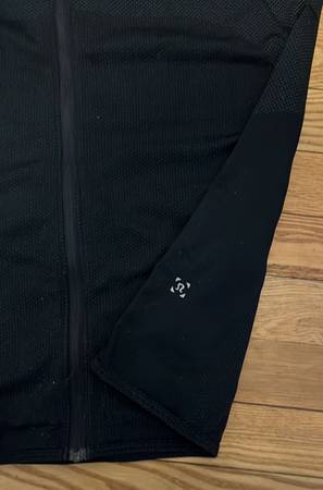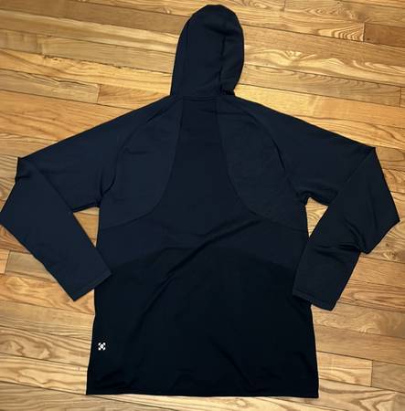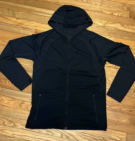 Lululemon blue full zip hooded jacket. Full zip hoodie. Two front zip closure pockets. No size tag or dot. Chest measures 40" and length is 28". According to Lululemon the measurements are a male medium. Metal vent tech fabric is four way stretch, lightweight and anti-stink. In great shape.