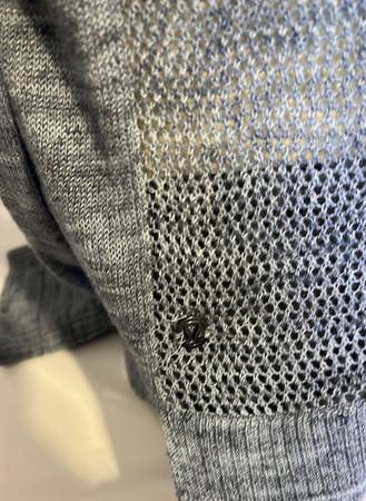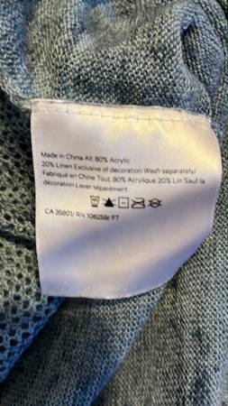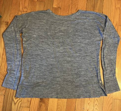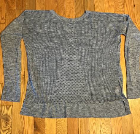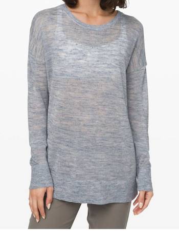 Lululemon lightweight and light blue sweater. Heather Speckle Petrol Blue is the official Lululemon color. Mesh back with pretty pattern/design. Chest measures around 45". Length is 22". 80% acrylic 20% Linen. In great shape.