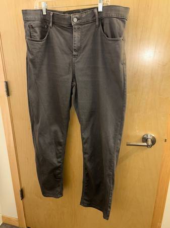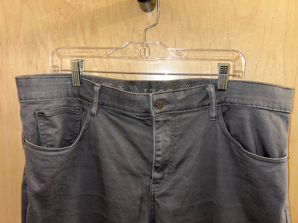 Grey jeans are worn but lots of life left in them-- small stain on one back pocket (might come out-- I haven't tried very hard)-- as shown in close up picture.