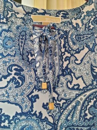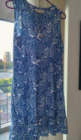 Offers welcome! Elegant blue paisley dress by Michael Kors 95% polyester, 5% elastane Sleeveless, tie neck, a-line silhouette Versatile for night out or casual Easy care & packs small for travel...