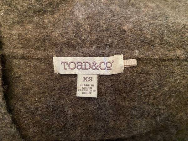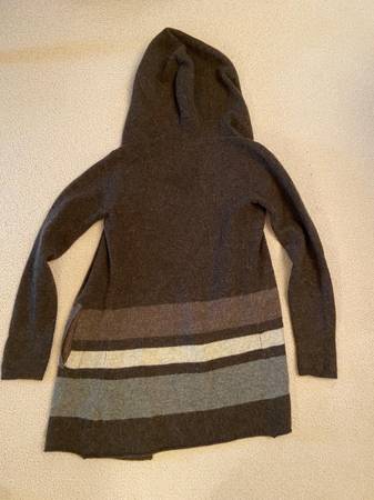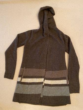 Toad & Co. Heartfelt Hoodie. Wool brown & grey stripe knit cardigan with hood and pockets. Perfect for layering. Smoke-free home. Size XS