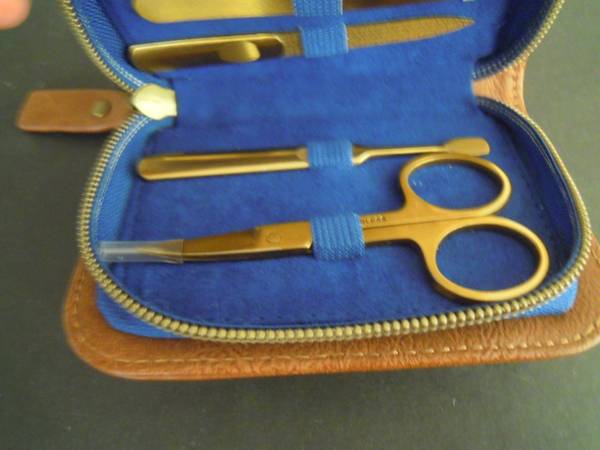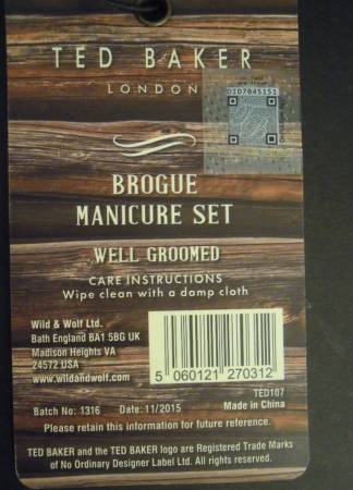 New, unused Ted Baker London Brogue Manicure Set. "Well Groomed." In a faux leather case that can be cleaned with a damp cloth. Includes the tools shown in gold colored stainless.