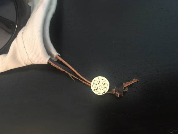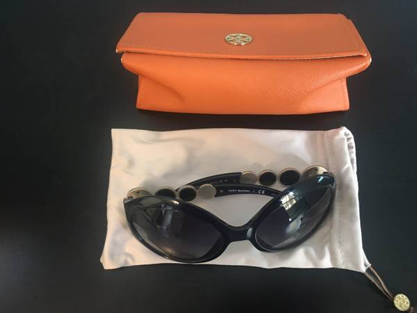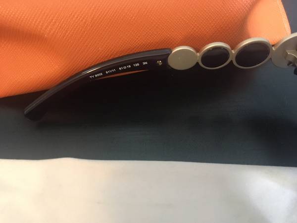 Designer sunglasses by Tory Burch. In Navy and matte gold. In excellent shape. Great style and design. Classic orange Tory Burch case and dust bag. No service scratches on glasses. Inside the bows of glasses is printed: Tory Burch, TY9002 511/11 61 19 125 3N. Nice pair of women's sunglasses.