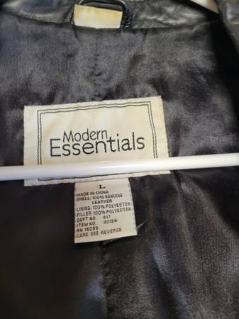 Modern Essentials black leather jacket. No rips or scratches. Lining intact. Size Large. 100% genuine leather. Bottom down with 2 front pockets. Smoke-free home. Pick up in Plymouth