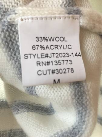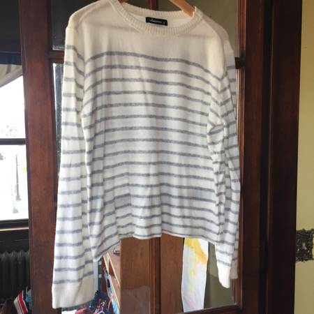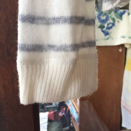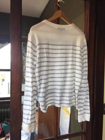 Never worn, this lightweight, soft cream sweater with grey stripes is in great condition.