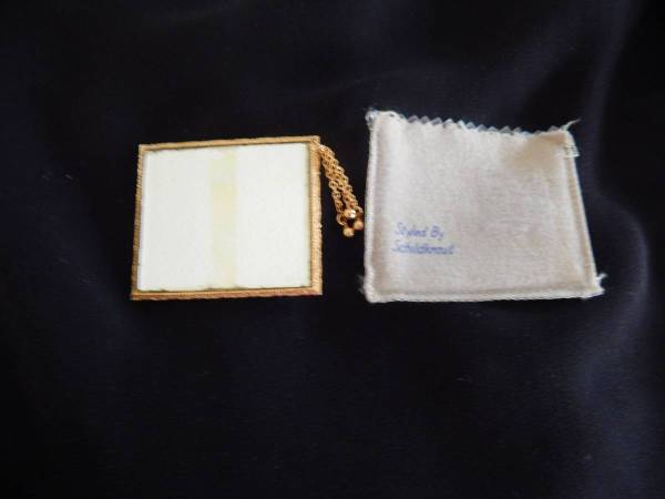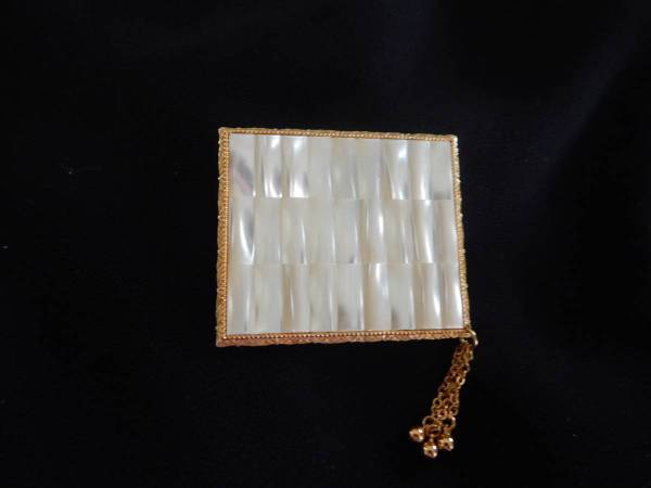 Vintage Purse Mirror Styled By Schildkraut Mother of Pearl Inlay. Beveled mirror surrounded by an ornate frame with 3 beaded chains. Mirror has yellowish strip, looks like tape . 2' 1/4 by 2' 3/4