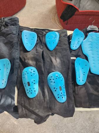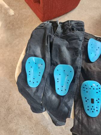 2 pair of Street & Steel brand Oakland riding jeans, size 34W x 31L. Includes one pair of hip armor and both pairs of knee armor. $145 for both (this price includes the $18 hip armor).