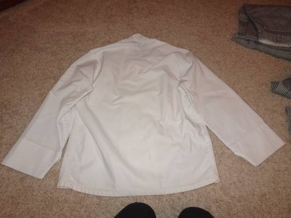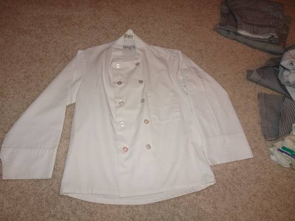 I have 10 Jackets, 6 are size 38 (M), and 4 are size 40 (L). I am asking $20 per jacket. If you buy all 10 I'll sell them for $180. There are also 4 pairs of gloves that I'll throw in with them. I also have 3 pairs of Bakers or Chefs pants for sale as well, size 30 x 32 which I'm asking $15 per pair or if you buy all 3 I'll sell them for $35.