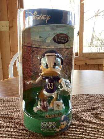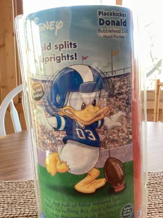 Donald Duck football player bobble head in perfect brand new condition. Never opened packaging. Perfect gift for Disney Donald Duck collectors and lovers. Box is 10 inches tall and bobble head...