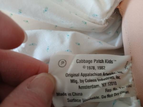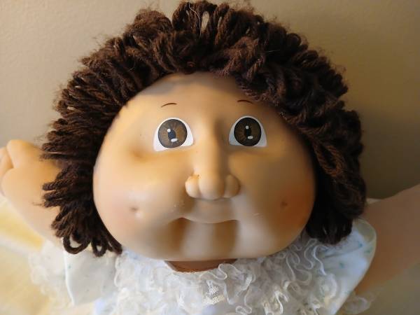 1984 Claudia Lenore Cabbage Patch Doll. Adorable doll with Cabbage Patch brand white dress with blue flowers, brown pony tail, and brown eyes. Has a Cabbage Patch brand diaper on as well. Well taken care of. No box or papers. Great shape for age—no stains or tears.