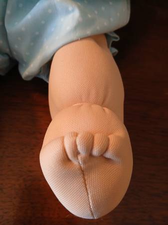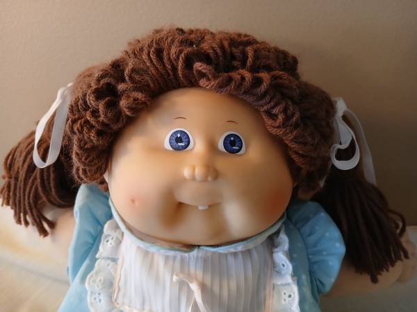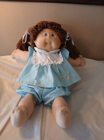 1986 Libby Alexa Cabbage Patch Doll. Cute doll with blue dress, brown pony tails, and blue eyes. Has a Cabbage Patch brand diaper on as well. Well taken care of. No box or papers. One little stain near the neck(most likely from just use and not from food or anything) and otherwise in great shape for age.