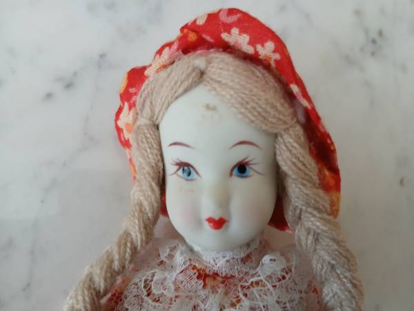 German themed porcelain doll. Made in Taiwan. Porcelain bust on up, hands, and legs(knee down). Feet are a bit cracked/broken, but otherwise in decent shape. 8 inches.