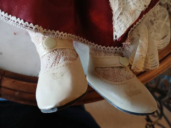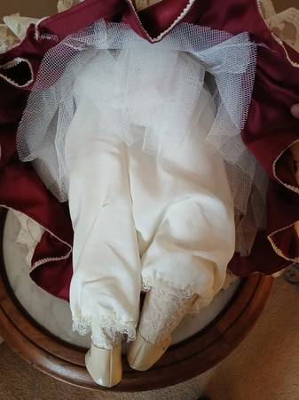 Porcelain Victorian themed doll. Hands, legs, face, and head are porcelain and the body is stuffed. No markings that I can find. Most curls are ok, but a few of them are flat. There is one broken finger, but it can be glued back on. It may be glued before it sells. The crinoline under the skirt is a bit flat in areas.