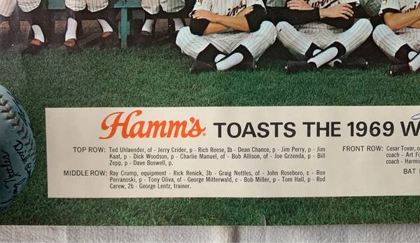 19.5” x 13.5” rolled poster of the 1969 Minnesota Twins, autographed in the 80s at a signing in Rochester by Harmon Killebrew.
