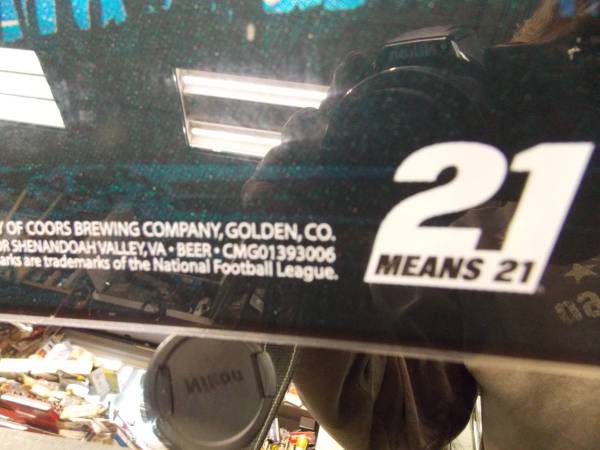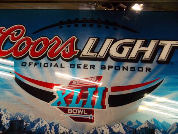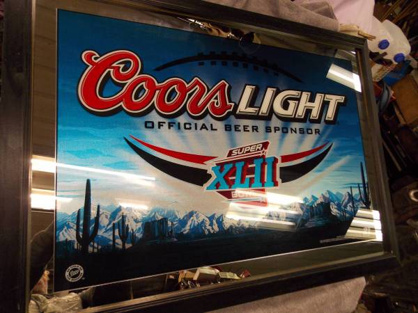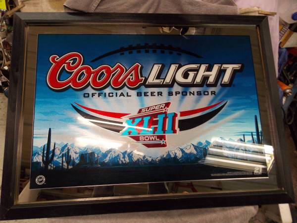 2007 Coors Light Beer Super Bowl XLII 42 Mirror GIANTS VS. PATRIOTS .Here's a great shape Mirror Picture to hang on your Man Cave Wall or Den Living Room ,wherever you want to put it. It measures total 44" wide and 32" Tall . Frame included in measurement .You can't go wrong with this great deal on a Foot Ball football room art work Picture. Call if interested 952-854-5 seven eight six