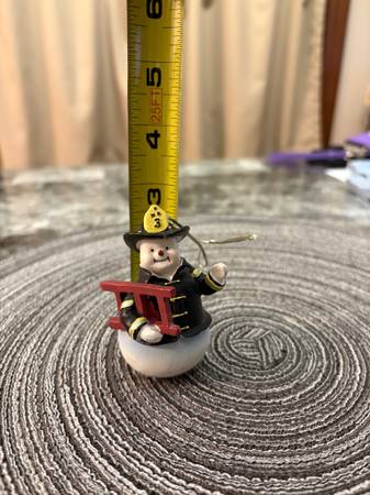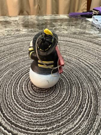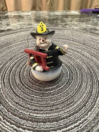 This charming snowman firefighter ornament is sure to add a special touch to any Christmas tree.