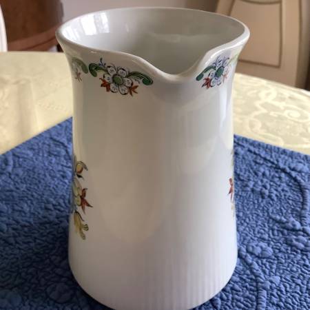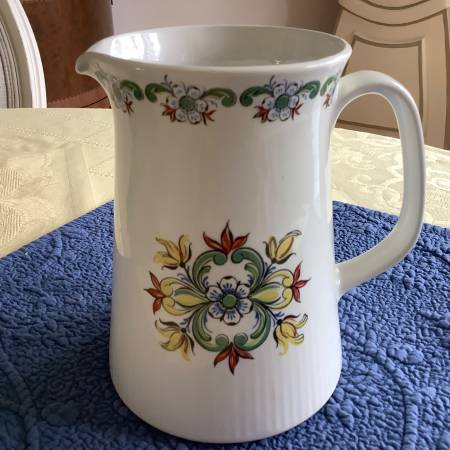 Lovely creamy white MCM pitcher from Norway. Company is Figgjo Flint. Rosemaling detail. Hand-Painted silkscreen. Wonderful condition. Stands about 6 ½ inches tall. No chips or cracks. $30 Cash....