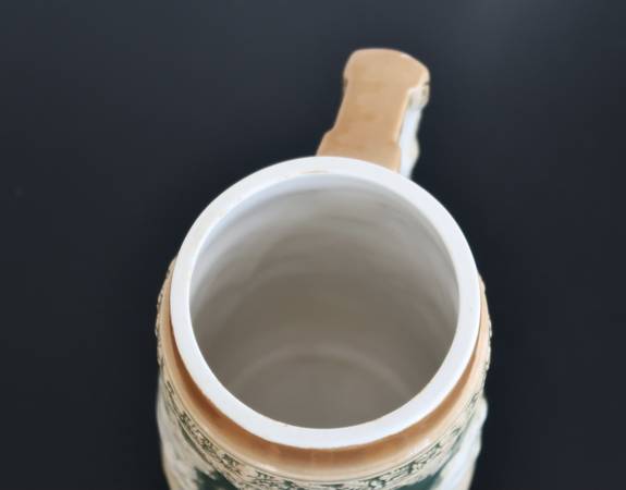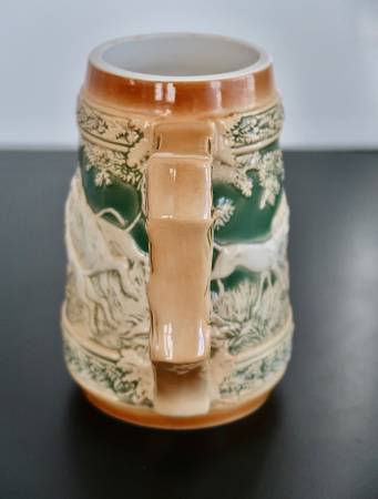 Vintage German beers stein made by Sitzendorfer Porzellanfabrik, ink stamped with the open pearl crown over crossed S mark used from 1902-1954. Highly detailed and raised design. Like new condition....