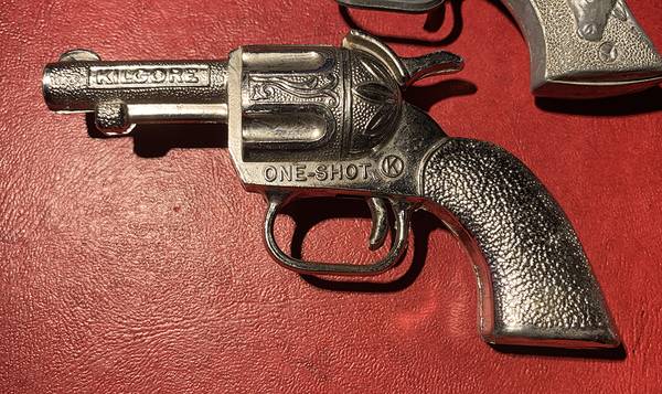 Two small guns from years ago. One is a Kilgore "One-Shot" with nearly perfect chrome coating. It has a nice snap when the fired. Measures 4.25" The other is a Hubley "Smoky" with some missing...