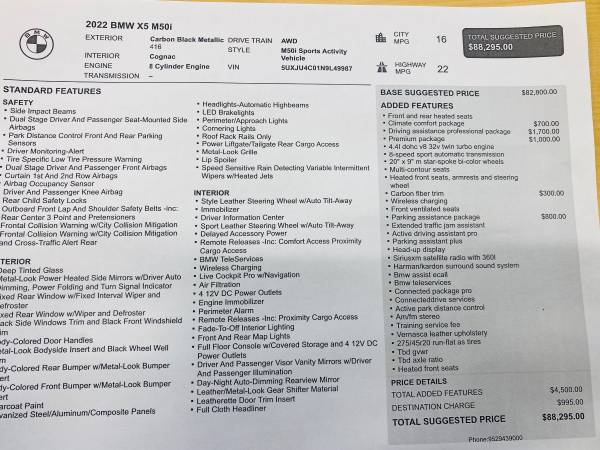 Like new, 2022 Bmw X5 M50i All wheel drive suv. BEAUTIFUL condition local trade in on Bmw, nice Carbon Black Metallic (Dark Blue), Rocket fast 4.4 Twin Turbo V8, ONLY 39000 miles. I have a copy of the window sticker showing extensive list of options on this car. Local Pickup – Clean Title – Great Financing Available