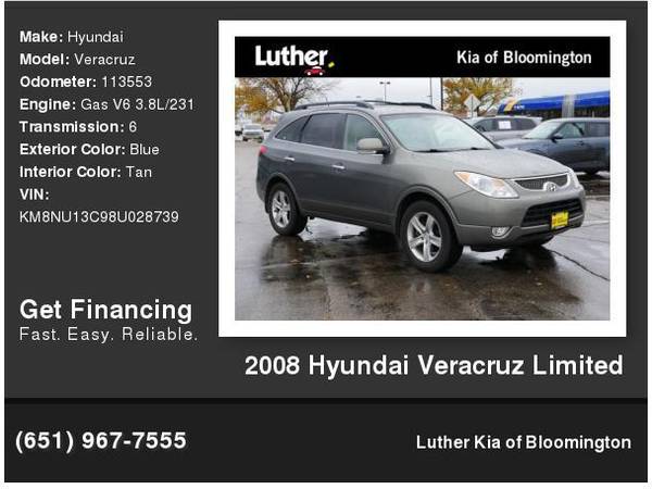 Limited trim. Clean, CARFAX 1-Owner. Moonroof, Third Row Seat, Heated Leather Seats, Multi-CD Changer, Satellite Radio, Power Liftgate, Rear Air, Aluminum Wheels, Premium Sound System, Consumer Guide Recommended SUV. CLICK NOW!KEY FEATURES INCLUDELeather Seats, Third Row Seat, Sunroof, Power Liftgate, Rear Air, Heated Driver Seat, Premium Sound System, Satellite Radio, Multi-CD Changer, Aluminum Wheels, Dual Zone A/C, Heated Seats, Heated Leather Seats Rear Spoiler, MP3 Player, Remote Trunk Release, Keyless Entry, Privacy Glass. Hyundai Limited with Deep Blue exterior and Beige interior features a V6 Cylinder Engine with 260 HP at 6000 RPM*.EXPERTS ARE SAYINGEdmunds.coms review says During the Veracruzs development, Hyundai set its sights not on the typical cast of competing automakers but on Lexus instead. As such, the Veracruz boasts an impressively luxurious cabin and a serene and quiet ride.. 5 Star Driver Front Crash Rating. 5 Star Driver Side Crash Rating.EXCELLENT SAFETY FOR YOUR FAMILYChild Safety Locks, Electronic Stability Control, Adjustable Pedals, Brake Assist, 4-Wheel ABS, 4-Wheel Disc Brakes, Tire Pressure Monitoring SystemWHY BUY FROM USAt Luther Kia of Bloomington we have the largest selection of new and Certified Pre-owned Kias and has been ranked #1 for Certified Pre Owned Kias in the Midwest for over 4 years. With this amazing selection of Certified Pre Owned vehicles you will receive the outstanding 10 year or 100,000 Mile Limited Powertrain Warranty along with the outstanding Luther Advantage. As part of the Luther Auto Family each vehicle comes with amazing benefits from $.10 off per gallon of gas & Holiday Gas Station tCheck whether a vehicle is subject to open recalls for safety issues at safercar.govHorsepower calculations based on trim engine configuration. Fuel economy calculations based on original manufacturer data for trim engine configuration. Please confirm the accuracy of the included equipment by calling us prior to purchase.