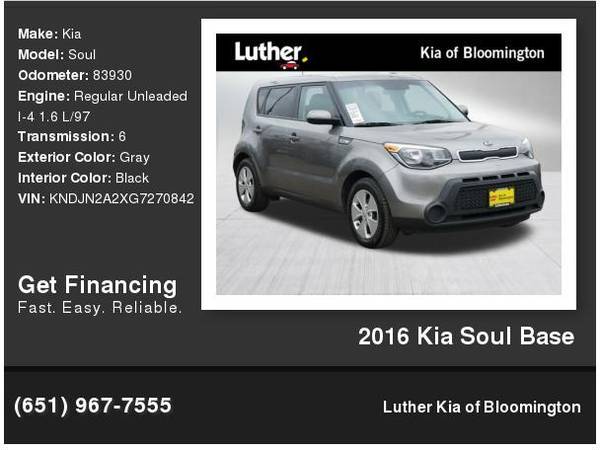 CARFAX 1-Owner, Clean. Base trim, Titanium Gray exterior and Black interior. REDUCED FROM $10,498!, PRICED TO MOVE $400 below J.D. Power Retail!, EPA 30 MPG Hwy/24 MPG City! Bluetooth®, iPod/MP3 Input, Aluminum Wheels, Satellite Radio. CLICK ME!KEY FEATURES INCLUDESatellite Radio, iPod/MP3 Input, Bluetooth®, Aluminum Wheels MP3 Player, Keyless Entry, Privacy Glass, Child Safety Locks, Steering Wheel Controls. Kia Base with Titanium Gray exterior and Black interior features a 4 Cylinder Engine with 130 HP at 6300 RPM*.PURCHASE WITH CONFIDENCECARFAX 1-Owner Kia CPO Lite covers eligible Kia vehicles that are 7-10 model years old, with 100,000 miles or less on the odometer. This program is designed to help give you peace of mind, and assurance that you have purchased a quality pre-owned vehicle. Kia Certified Pre-Owned Lite vehicle owners enjoy a 6 Month/6,000 Miles Limited Powertrain Warranty. Every Kia Certified Pre-Owned vehicle must pass a rigorous 135-point inspection, conducted by a Kia factory trained technician, and includes a vehicle history report (Carfax) and Roadside Assistance.EXPERTS ARE SAYINGEdmunds.com explains One of the benefits of the Souls boxy design is an abundance of head- and legroom, even in the backseat. Behind the rear seatbacks youll find 19 cubic feet of cargo room. This is greater than compact hatchbacks and on par with some SUVs..EXCELLENT SAFETY FOR YOUR FAMILYElectronic Stability Control, Brake Assist, 4-Wheel ABS, 4-Wheel Disc Brakes, Tire Pressure Monitoring System Great Gas Mileage: 30 MPG Hwy.OUR OFFERINGSAt Luther Kia of Bloomington we have the largest selection of new and Certified Pre-owned Kias and has been ranked #1 for Certified Pre Owned Kias in the Midwest for over 4 years. With this amazing selection of Certified Pre Owned vehicles you will receive the outstanding 10 year or 100,000 Mile Limited Powertrain Warranty along with the outstanding Luther Advantage. As part of the Luther Auto Family each vehicle comes with amazing benefits from $.10 off per gallon of gas & Holiday Gas Station tCheck whether a vehicle is subject to open recalls for safety issues at safercar.govHorsepower calculations based on trim engine configuration. Fuel economy calculations based on original manufacturer data for trim engine configuration. Please confirm the accuracy of the included equipment by calling us prior to purchase.