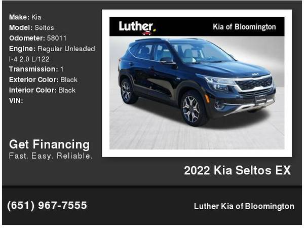 Kia Certified **10-Year/100k Warranty** CARFAX 1-Owner, Clean. PRICED TO MOVE $3,000 below J.D. Power Retail! FUEL EFFICIENT 31 MPG Hwy/27 MPG City! Heated Seats, Navigation, Moonroof, Remote Engine Start, Onboard Communications System, iPod/MP3 Input, Aluminum Wheels SEE MORE!*********************PURCHASE WITH CONFIDENCE WITH Kia CERTIFIED PRE-OWNED(CPO)*********************Kia Certified Pre-Owned vehicles provide their owners with assurance that they have purchased a quality used vehicle. 10-year / 100,000-mile Kia Certified Limited Powertrain Warranty, 12 month / 12,000 mile platinum level mechanical coverage, Roadside Assistance, Travel Breakdown Coverage, 164 - Point Quality Assurance Inspection, CARFAX® Vehicle History Report on eligible vehicles, 10-Year Unlimited Mileage Roadside Assistance Plan Towing / Rental / Travel Breakdown Benefits Eligible.AFFORDABLEThis Seltos is priced $3,000 below J.D. Power Retail.************ KEY FEATURES INCLUDE ************Rear Spoiler, MP3 Player, Keyless Entry, Remote Trunk Release, Privacy Glass.*********************OPTION PACKAGES*********************EC MIRROR Kia EX with Cherry Black exterior and Black interior features a 4 Cylinder Engine with 146 HP at 6200 RPM*.EXPERTS CONCLUDEGreat Gas Mileage: 31 MPG Hwy.******************** WHY BUY FROM US ********************At Luther Kia of Bloomington we have the largest selection of new and Certified Pre-owned Kias and has been ranked #1 for Certified Pre Owned Kias in the Midwest for over 4 years. With this amazing selection of Certified Pre Owned vehicles you will receive the outstanding 10 year or 100,000 Mile Limited Powertrain Warranty along with the outstanding Luther Advantage. As part of the Luther Auto Family each vehicle comes with amazing benefits from $.10 off per gallon of gas & Holiday Gas Station top-tier the Works car wash for $6.00 as well as specials on repairs, a full range of discounts, advantages & guarantees.Check whether a vehicle is subject to open recalls for safety issues at safercar.govHorsepower calculations based on trim engine configuration. Fuel economy calculations based on original manufacturer data for trim engine configuration. Please confirm the accuracy of the included equipment by calling us prior to purchase.