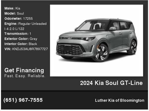 Kia Certified **10-Year/100k Warranty** CARFAX 1-Owner, Clean, GREAT MILES 17,255! FUEL EFFICIENT 33 MPG Hwy/27 MPG City! PRICED TO MOVE $4,700 below J.D. Power Retail! Moonroof, Navigation, Heated Seats, Blind Spot Monitor, Apple CarPlay®, Lane Keeping Assist READ MORE!*********************PURCHASE WITH CONFIDENCE WITH Kia CERTIFIED PRE-OWNED(CPO)*********************Kia Certified Pre-Owned vehicles provide their owners with assurance that they have purchased a quality used vehicle. 10-year / 100,000-mile Kia Certified Limited Powertrain Warranty, 12 month / 12,000 mile platinum level mechanical coverage, Roadside Assistance, Travel Breakdown Coverage, 164 - Point Quality Assurance Inspection, CARFAX® Vehicle History Report on eligible vehicles, 10-Year Unlimited Mileage Roadside Assistance Plan Towing / Rental / Travel Breakdown Benefits Eligible.EXCELLENT VALUEThis Soul is priced $4,700 below J.D. Power Retail.************ KEY FEATURES INCLUDE ************Privacy Glass, Keyless Entry, Steering Wheel Controls, Child Safety Locks, Heated Mirrors.*********************OPTION PACKAGES*********************GT-LINE TECHNOLOGY PACKAGE Cargo Cover, Dual Level Cargo Board, Electronic Parking Brake, Radio: harman/kardon® Premium Audio System, center speaker, Speaker Lights, multiple ambience themes, Forward Collision Avoidance-Assist, fusion, cyclist and junction turning, Navigation-Based Smart Cruise Control (NSCC-C), Highway Driving Assist, LED Headlights, Positioning Lights & Tail Lights, Heated Front Seats, 8-way power drivers seat w/2-way power lumbar support, LED Fog Lights Kia GT-Line with Steel Gray exterior and Black interior features a 4 Cylinder Engine with 147 HP at 6200 RPM*.EXPERTS REPORTGreat Gas Mileage: 33 MPG Hwy.******************** WHY BUY FROM US ********************At Luther Kia of Bloomington we have the largest selection of new and Certified Pre-owned Kias and has been ranked #1 for Certified Pre Owned Kias in the Midwest for over 4 years. With this amazing selection of Certified Pre Owned vehicles you will receive the outstanding 10 year or 100,000 Mile Limited Powertrain Warranty along with the outstanding Luther Advantage. As part of the Luther Auto Family each vehicle comes with amazing benefits from $.10 off per gallon of gas & Holiday Gas Station top-tier the Works car wash for $6.00 as well as specials on repairs, a full range of discounts, advantages & guarantees.Check whether a vehicle is subject to open recalls for safety issues at safercar.govHorsepower calculations based on trim engine configuration. Fuel economy calculations based on original manufacturer data for trim engine configuration. Please confirm the accuracy of the included equipment by calling us prior to purchase.