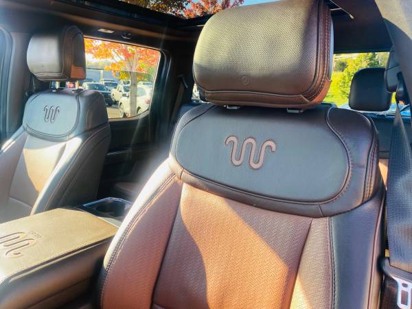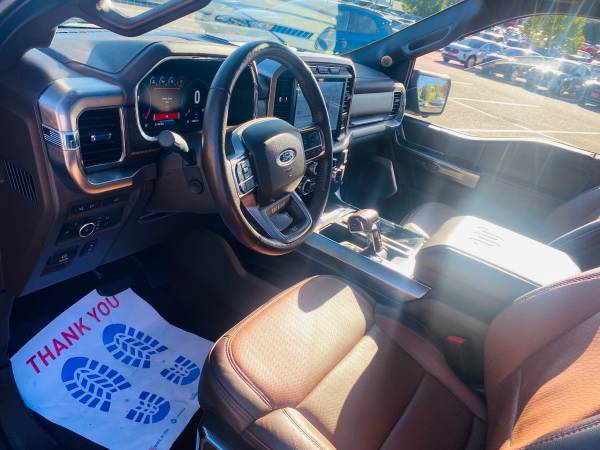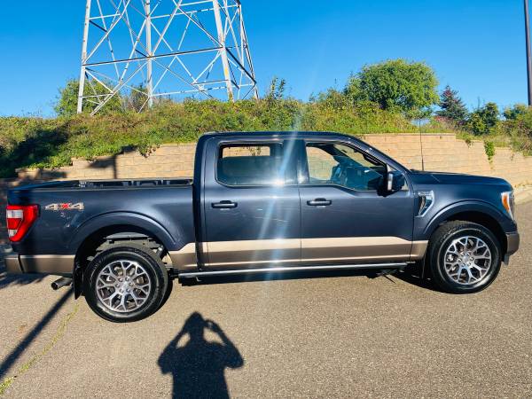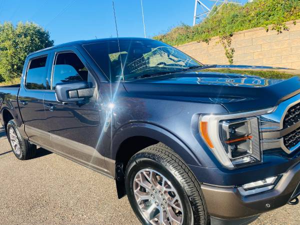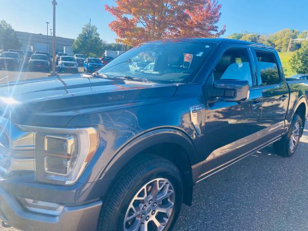 Beautiful condition 2022 Ford F150 King Ranch Crew Cab 4x4. Fresh/local trade in on new, has Fords best 3.5 Ecoboost twin turbo V6, roomy cab, power sliding window to pickup box, power running boards, Navigation with huge screen, shifter hideaway for work station, King Ranch exclusive custom leather interior, opening glass roof with sunshade, heated steering wheel, heated front seats, heated rear seats, a/c plug in, only 50,000 miles/clean documented title history.
