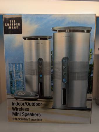 Futuristic styling and indoor/outdoor capability are the top features of the Sharper Image CT413 Wireless Speakers. The two nine inch tall speakers in the system look like little silver time capsules and can be powered with batteries or an AC adapter. If you go for the battery option so that you can tote them around with you from room to room - 6 C-cell batteries in each speaker. If you aren’t needing that kind of portability you can even wall mount the speakers which is a great idea for your screen porch or outside patio.