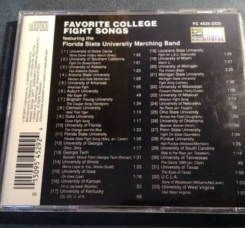 Here is a CD of some classic college fight songs. There are 33 different fight songs featured on this CD. It is in excellent condition.
