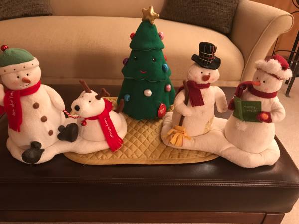 These are 3 very cute musical decorations. The Hallmark Snowman and Dog plays "Jingle Bells" while the Snowman dances and the Dog barks and when it moves the bell on its neck jingles. The Christmas Tree plays "Rockin' Around the Christmas Tree" and the tree spins and sways back and forth as the song plays. The Mr. and Mrs. Christmas Carolers sings "We Wish You A Merry Christmas." They have brand new batteries!!!!!!!! The Christmas Tree is brand-new-with -tags.