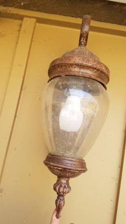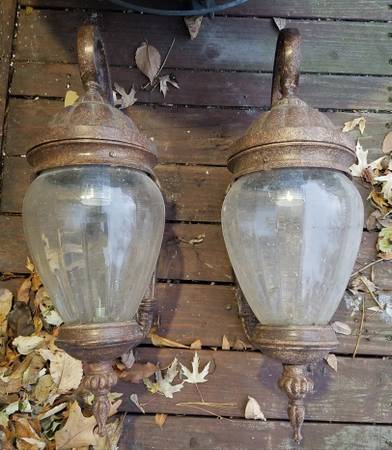 Pair of exterior light fixtures. The back panel is 11 1/4" tall, the light is 18" tall. Dusty from being stored. LOCAL PICKUP ONLY, no shipping. Cash only. lights deck porch house outdoor lighting...