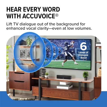 Despite its size, it delivers impressive audio clarity with six levels of AccuVoice voice boost, utilizing hearing aid technology to enhance dialogue and minimize background noise.