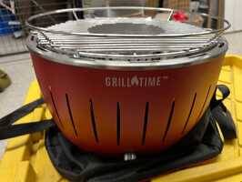 Compact and portable grill in a carry case. Heats up in 4 minutes so you can start grilling quickly Temperature control fan ensures you get the right amount heat during your cook Deflects drippings away from charcoal for nearly smoke-free grilling Grill grates and inner bowl are dishwasher safe for easy cleaning Includes red Tailgater GT grill, carrying case, 4 AA batteries, 2lb bag of charcoal, and a 6oz bottle of starter gel The Tailgater GT is the portable charcoal grill that makes grill time, all the time. Its small size and included carry case make the Tailgater GT perfect for grilling on the go. Lighting the grill is a breeze; place a small amount of the included Grill Time Starter Gel under the charcoal container, light it, then place the filled charcoal container on top. The grill heats up in just 4 minutes, and it can run for up to 60 minutes depending on how high the fan is running. The temperature control fan is operated by a knob on the front of the grill. An LED bezel around the control know glows to indicate the setting at which the fan is running. The grill is designed to deflect drippings away from the burning charcoal, making it nearly smokeless. The 12 1/2-inch diameter grill grate is the perfect size for grilling for up to 5 people. The inner bowl acts a drip pan, as well as a heat deflector to keep the outside of the grill cool to the touch. The grill grate, charcoal container, and inner bowl can be latched down to keep the grill secure when cooking. When you have finished cooking and the grill has cooled, the grill grate and inner bowl can be removed to clean in a sink or dishwasher. This Starter Pack includes a red Tailgater GT grill, carrying case, 4 AA batteries, a 2lb bag of 100 percent natural wood charcoal, and a 6oz bottle of starter gel.