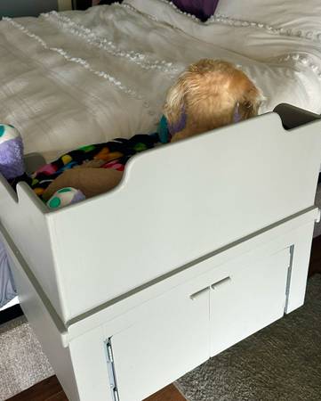 One and only custom made dog bed, keep your little buddy close @ night but keep your bed to yourself!! Amazing dog bed, large storage for toys and treats in the back! Brilliant idea! $40. Paid $125.