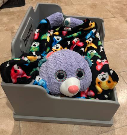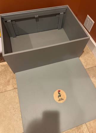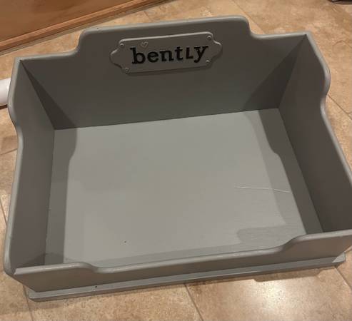 This is a custom made dog bed! The long piece of wood, slides under your mattress so the bed is @ the same height as the bed, so your dog is not taking up any room on the bed! Storage doors on the back it’s super cool! Custom hand made!