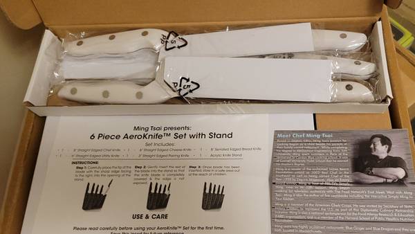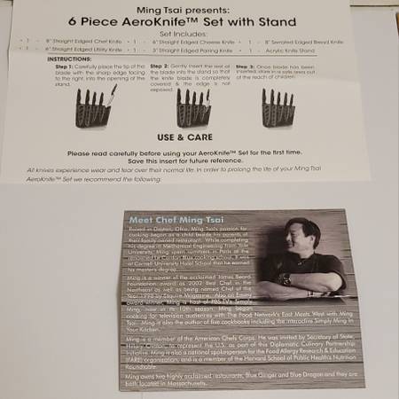 I'm selling a brand new 5 piece Aero Knife set and it includes a see thru acrylic display stand. It's in the original box and has never been used. As you can see in the last photos, the knives are...